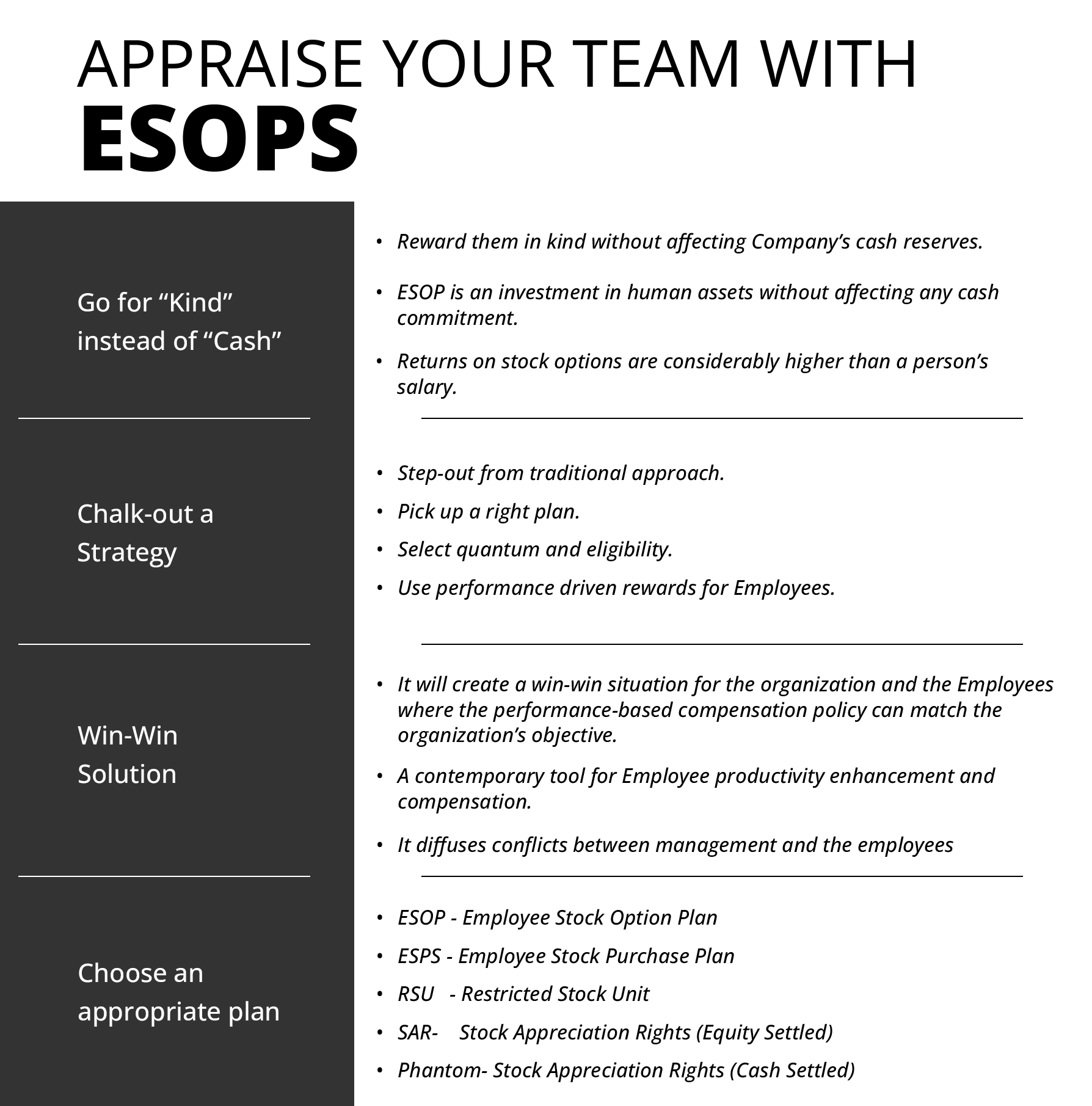 The best part of ESOP as a compensation strategy is that it offers freedom to link Employee reward with individual performance and Company performance.